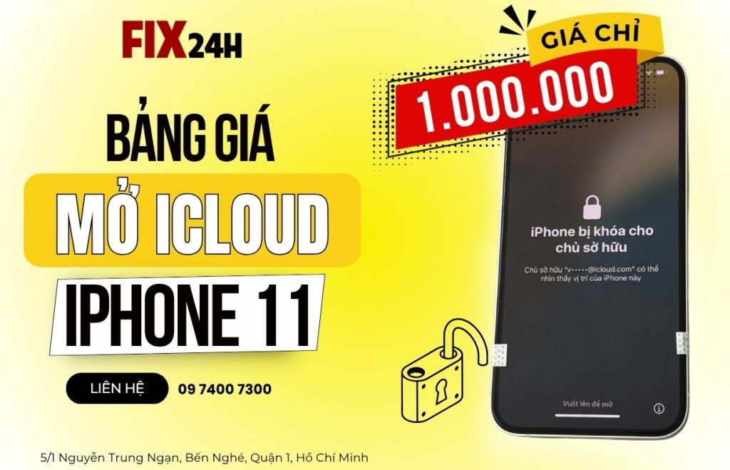 Nếu bạn đang gặp rắc rối với việc khóa iCloud trên iPhone 11 của mình, dịch vụ mở khóa iCloud tại Fix24h chính là giải pháp lý tưởng. Chỉ với giá từ 1.000.000 đồng, bạn có thể mở khóa nhanh chóng mà không cần tháo máy. Thời gian xử lý chỉ khoảng 20 phút, giúp bạn nhanh chóng lấy lại quyền kiểm soát thiết bị của mình.