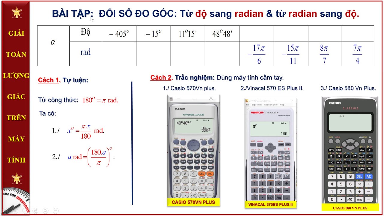 Ngược lại, nếu bạn muốn chuyển từ độ sang radian, chỉ cần lấy giá trị độ nhân với π và chia cho 180. Việc sử dụng máy tính Casio FX-580VN X giúp bạn thực hiện chuyển đổi này nhanh chóng và chính xác, tiết kiệm thời gian đáng kể trong quá trình giải bài tập.