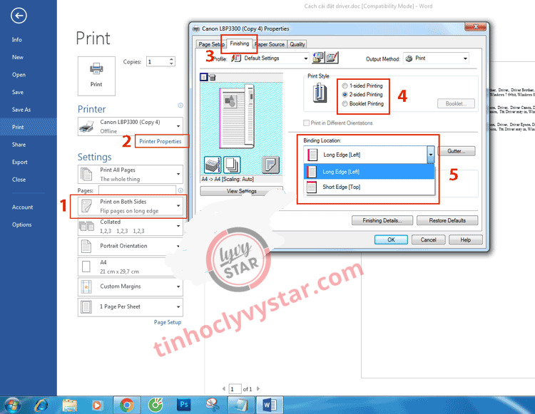 Tiếp theo, hãy tìm đến tab Printing Shortcuts và chọn Print on Both Sides. Điều này sẽ giúp bạn in tài liệu một cách hiệu quả mà không phải mất thời gian lật giấy thủ công. Ngoài ra, bạn cũng có thể chọn khổ giấy A4, một lựa chọn rất phổ biến, giúp in ấn trông chuyên nghiệp hơn.