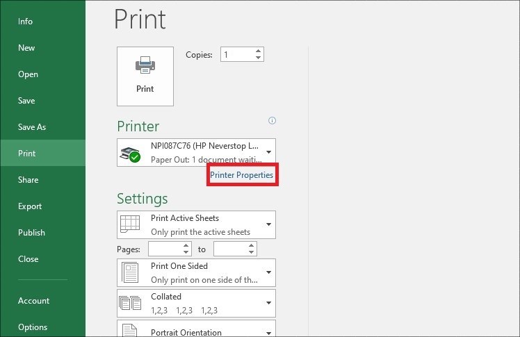 Nếu bạn muốn in hai mặt trong Excel để có thể đóng gáy gọn gàng, hãy làm theo các bước đơn giản sau. Bắt đầu bằng việc mở file Excel cần in, sau đó nhấn tổ hợp phím Ctrl + P để mở hộp thoại Print. Khi đã mở lên, bạn sẽ thấy tùy chọn Properties; hãy click vào đó để điều chỉnh các thiết lập in.