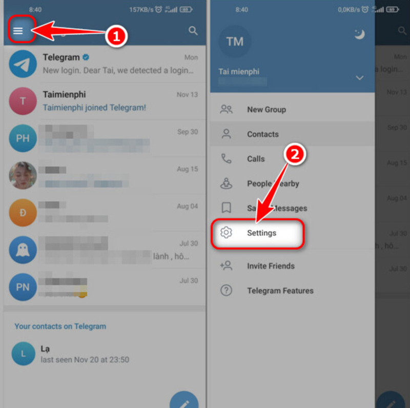 Để lấy link Telegram cá nhân của bạn, đầu tiên hãy đăng nhập vào tài khoản Telegram. Sau khi vào ứng dụng, bạn sẽ thấy góc trái trên cùng của màn hình có biểu tượng dấu ba gạch, hãy nhấn vào đó để mở menu. Tiếp theo, chọn phần “Cài đặt” để tiếp tục.