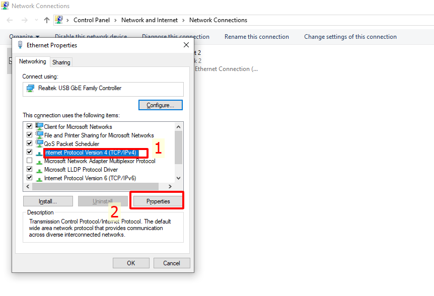 Tại đây, chọn “Change adapter settings”, tìm mạng bạn đang sử dụng (Ethernet hoặc WiFi) và nhấp chuột phải vào nó để chọn “Properties”. Khi vào trong, bạn tìm mục “Internet Protocol Version 4 (TCP/IPv4)”, nhấp vào đó và chọn “Properties” một lần nữa. Nếu bạn muốn đổi sang địa chỉ IP tĩnh, hãy tick vào ô “Use the following IP address”.