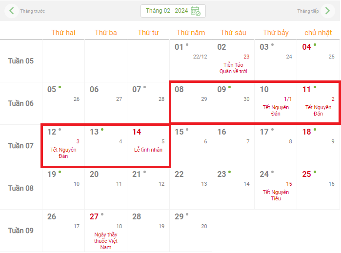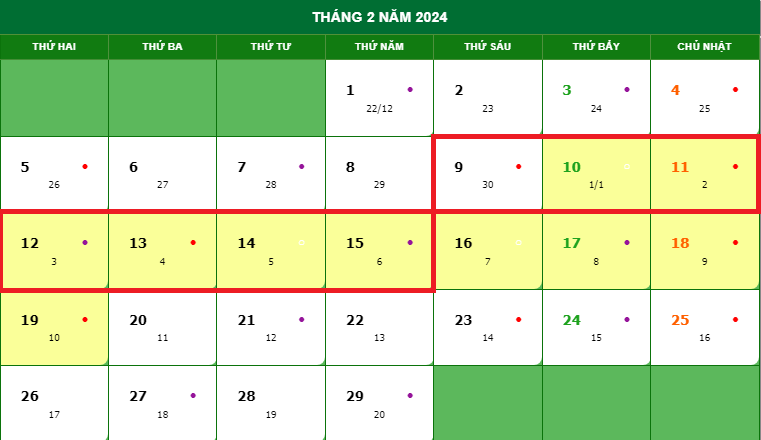 Theo kế hoạch, lịch nghỉ Tết năm 2024 sẽ kéo dài từ ngày 8 đến hết ngày 14 tháng 2, tạo điều kiện cho mọi người có khoảng thời gian để sum vầy bên gia đình và bạn bè. Tết không chỉ là khoảng thời gian để nghỉ ngơi, mà còn là dịp để mọi người thể hiện tình cảm, gắn kết với nhau hơn. Hãy cùng đếm ngược đến Tết, để cùng nhau đón chào những điều tốt đẹp trong năm mới!