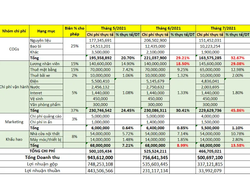 Với các cột mục rõ ràng như doanh thu, chi phí nguyên vật liệu, chi phí cố định, và lợi nhuận, file Excel giúp người quản lý dễ dàng nhận diện những vấn đề tài chính cần điều chỉnh. Làm chủ một quán cafe không chỉ đơn thuần là phục vụ đồ uống ngon, mà còn cần nắm rõ tình hình tài chính một cách chính xác và kịp thời.