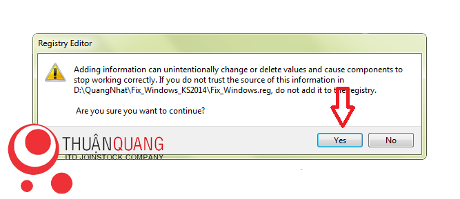 Tiếp theo, bạn nên tải về file sửa lỗi có tên là “fix_khoi_dong_kis2015”, sau đó giải nén để có file .reg. Trước khi chạy file này, hãy đảm bảo tắt tất cả ứng dụng Kaspersky để quá trình sửa lỗi được thực hiện suôn sẻ. Khi chạy file, bấm “Yes” để xác nhận việc sửa đổi các thông số hệ thống.