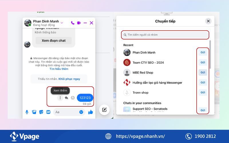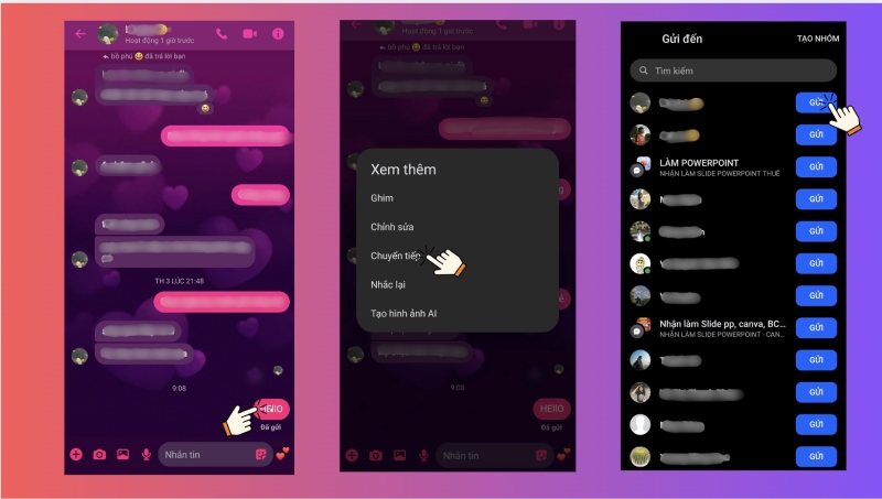 Tiếp theo, bạn nhấn và giữ vào tin nhắn đã soạn, chọn tùy chọn Chuyển tiếp, và rồi lựa chọn những người nhận mong muốn. Điều này thật dễ dàng và hiệu quả, đặc biệt khi bạn muốn thông báo một sự kiện hay đơn giản chỉ là những lời chúc mừng. Tuy nhiên, nếu bạn dùng fanpage, bạn có thể thực hiện gửi nhiều nội dung đến nhiều người bằng cách vào Menu Settings và chọn các công cụ phù hợp.
