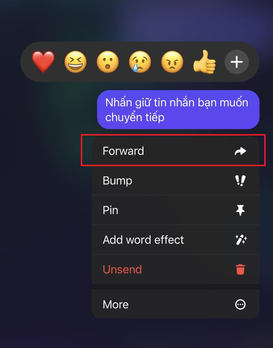 Tiếp theo, bạn chỉ cần nhấn và giữ vào tin nhắn vừa gửi, rồi chọn tùy chọn Chuyển tiếp. Tại đây, bạn hãy chọn những người mà bạn muốn gửi tin nhắn. Việc này giúp bạn tiết kiệm thời gian, tránh phải sao chép, dán nhiều lần, mà vẫn đảm bảo thông điệp được truyền tải đến đúng người.