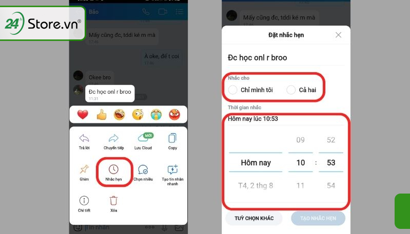 Khi đã vào được menu tùy chọn, hãy chọn tính năng “Nhắc hẹn” có biểu tượng giống chiếc đồng hồ. Tại đây, bạn có thể soạn nội dung tin nhắn mà mình muốn gửi. Sau khi viết xong, đừng quên chọn thời gian và ngày cụ thể để tin nhắn được gửi đi. Cuối cùng, chỉ cần nhấn “Xác nhận” và mọi thứ đã hoàn tất.