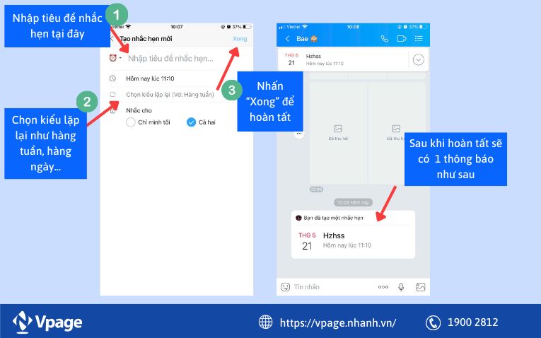 Sau đó, chọn mục “Nhắc hẹn”. Bạn sẽ thấy một ô để điền thông tin nội dung tin nhắn mà bạn muốn gửi. Đừng quên thiết lập thời gian và ngày cụ thể để tin nhắn được gửi đi đúng lúc nhé. Nhấn “Xong” là xong việc hẹn giờ.