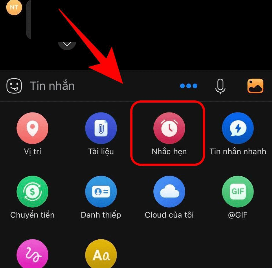 Sau khi vào khung soạn tin nhắn, bạn hãy tìm biểu tượng ba chấm ở góc bên dưới màn hình và nhấn vào đó. Một menu sẽ hiện ra, trong đó có tùy chọn “Nhắc hẹn”. Hãy chọn tùy chọn này để tiếp tục. Bạn sẽ được yêu cầu điền thông tin cho tin nhắn hẹn giờ, bao gồm nội dung tin nhắn và thời gian cụ thể mà bạn muốn nó được gửi đi.