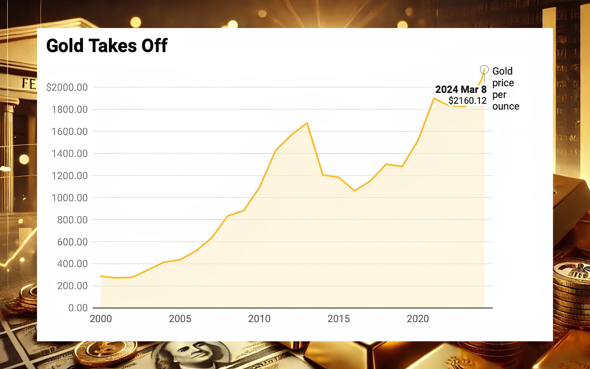 Nhìn lại giai đoạn từ 2000 đến 2024, giá vàng đã tăng hơn 755%, từ 279 USD/ounce lên hơn 2.388 USD vào năm ngoái. Sự bùng nổ này không chỉ phản ánh sự biến động của nền kinh tế mà còn cho thấy vai trò quan trọng của vàng trong danh mục đầu tư của nhiều người. Năm 2024, giá vàng cao đến mức chóng mặt, từ 2.000 USD lên 2.700 USD, đúng là một cuộc hành trình đầy thăng trầm.