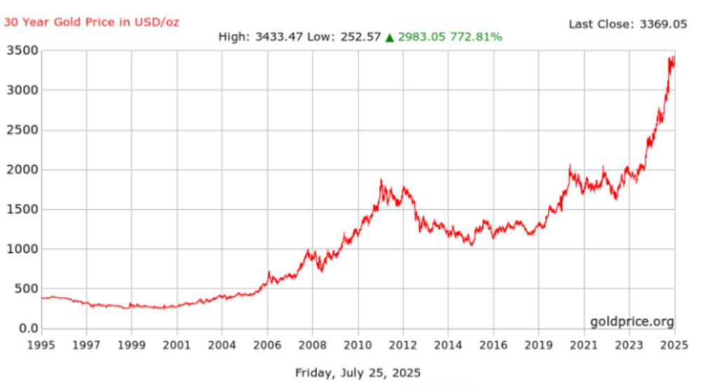 Có thể thấy rõ rằng trong những năm tiếp theo, giá vàng đã tăng nhanh chóng, ví dụ từ cuối năm 2003 đến đầu năm 2004, nó đã vượt qua ngưỡng 400 USD/ounce. So với bây giờ, giá vàng năm 2000 khá thấp, nhưng lại cung cấp cái nhìn quan trọng về sự trưởng thành của thị trường vàng sau này. Đặc biệt, tốc độ tăng giá vàng trong 25 năm qua thật sự đáng kinh ngạc, từ 279 USD/ounce năm 2000 lên trên 3.000 USD/ounce hiện tại.