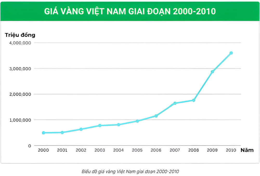 Năm 2000, giá vàng tại Việt Nam dao động trong khoảng từ 3,5 đến 4 triệu đồng mỗi lượng, trong khi giá vàng thế giới ghi nhận khoảng 279 USD mỗi ounce. Đây là một thời điểm khá đặc trưng, phản ánh thị trường vàng còn nhiều biến động vì sự phát triển chưa hoàn thiện. Cụ thể, mức giá vàng trung bình lúc bấy giờ khoảng 680.000 VNĐ/chỉ, cho thấy vàng vẫn chủ yếu được xem như một tài sản an toàn hơn là một công cụ đầu tư chính thống.