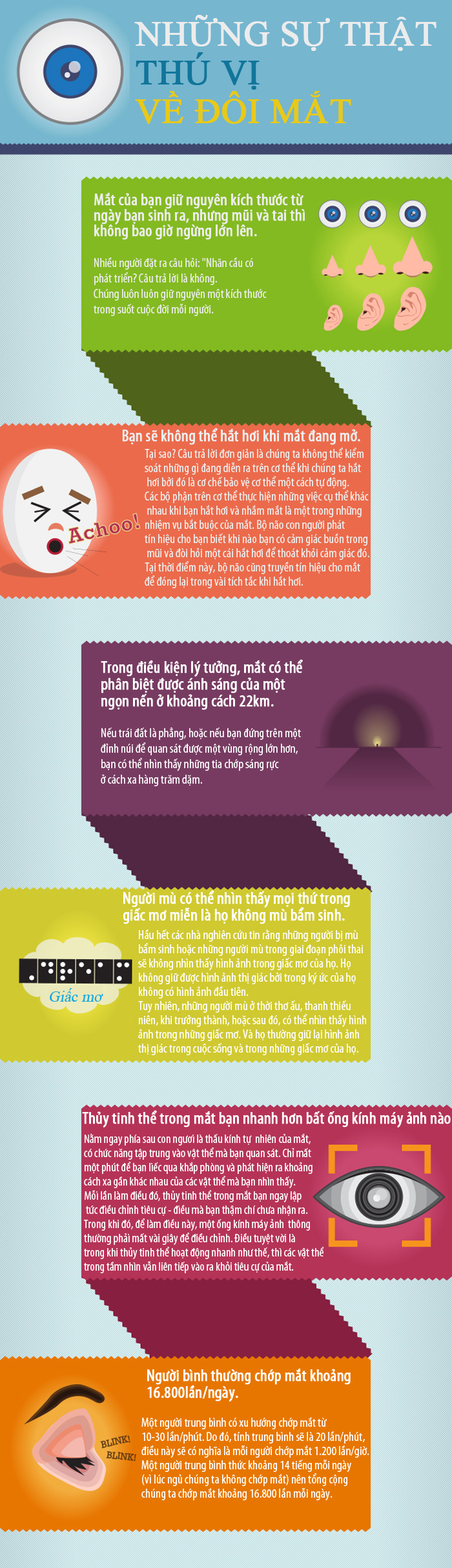Đôi mắt, bộ phận tinh vi và thần kỳ nhất của cơ thể, có nhiều điều thú vị mà có thể bạn chưa từng nghĩ đến. Một đôi mắt người bình thường dài khoảng 2,54 cm và nặng khoảng 8 gram. Một sự thật thú vị là bạn không thể mở mắt khi hắt hơi, điều này giúp bảo vệ mắt khỏi bụi bẩn hay vi khuẩn.
