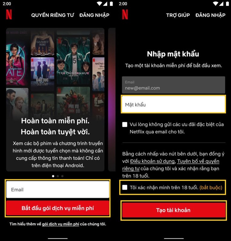 Nếu bạn muốn có một tài khoản Netflix miễn phí ngay lập tức, hãy tải ứng dụng Netflix về điện thoại hoặc máy tính bảng, sau đó chọn gói dịch vụ miễn phí. Đơn giản chỉ cần nhập email và tạo mật khẩu là bạn đã có thể khám phá thế giới phim ảnh vô tận của Netflix.