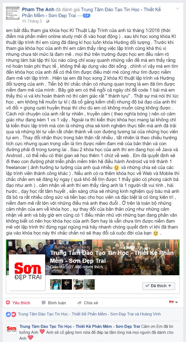 Nhiều học viên từng theo học đều đánh giá cao cách truyền đạt tỉ mỉ, cặn kẽ và sự nhiệt huyết của anh Sơn, giúp họ không chỉ hiểu sâu về lập trình mà còn tìm thấy niềm đam mê với ngành này. Khóa học có mức học phí hợp lý, thường có ưu đãi giảm giá, phù hợp với nhiều đối tượng học viên. Nếu bạn đang tìm một khóa học lập trình online chất lượng, thân thiện và thực tế, khóa học của Sơn Đẹp Trai là một lựa chọn đáng cân nhắc.