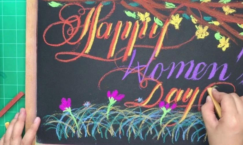 Một yếu tố quan trọng khi trang trí bảng là thông điệp truyền tải. Bạn nên đảm bảo rằng các câu chúc mừng hoặc thông điệp ý nghĩa được viết ngắn gọn, dễ hiểu nhưng vẫn đầy cảm xúc. Họa tiết trang trí cũng cần được đan xen một cách hài hòa, tránh tạo cảm giác rối mắt. Đừng quên sử dụng phấn màu nổi bật để thu hút sự chú ý, đặc biệt là khi viết những dòng chữ như “Chúc mừng ngày Quốc tế Phụ nữ 8/3”.